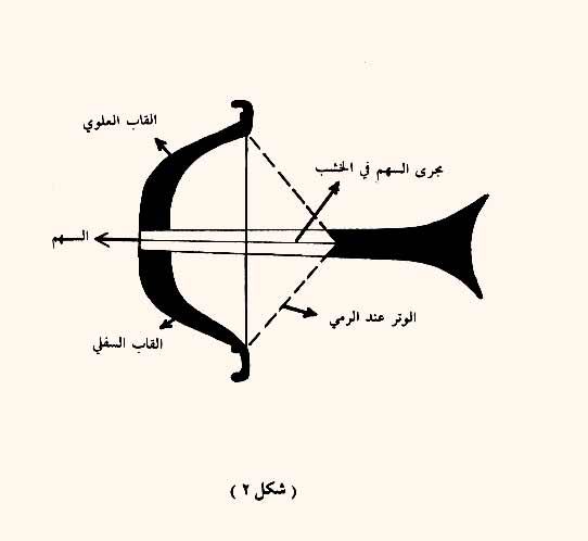 القوس [2] في الأصل، عود من شجر جبلي صلب، يحنى طرفاه بقوة، ويشد فيهما وتر من الجلد أو العصب الذي يكون في عنق البعير، وهو يشبه إلى حد ما قوس المنجدين في هـذه الأيام.