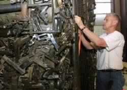 Artist Wallis Kendal puts the finishing touches on his gun sculpture entitled 'The Art of Peacemaking' at United Nations headquarters Sunday, July 8, 2001. The exhibit will opened on the 9th of July on the first day of the U.N. Conference on the Illicit Trade in Small Arms and Light Weapons. The U.N. conference to curb illegal small arms trafficking entered its second and final week Monday. (AP Photo/Shawn Baldwin)